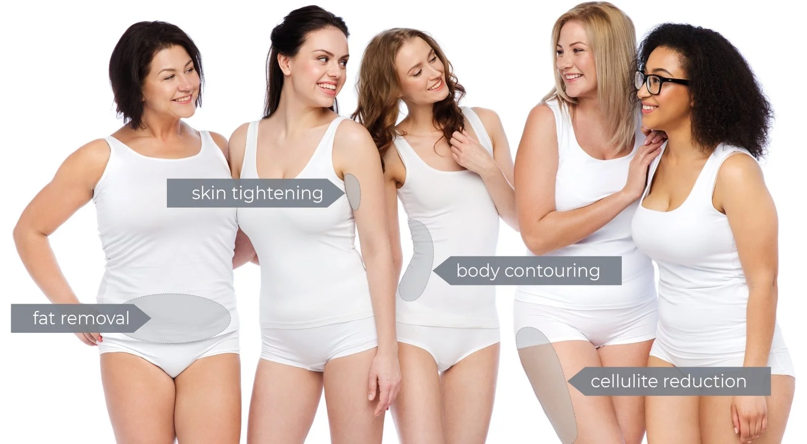 Five women wearing white tank tops and shorts, smiling and interacting. Labels indicate areas of skin tightening, body contouring, fat removal, and cellulite reduction.